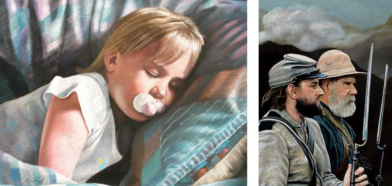Alan Fink, Pink Pacifier, pastel, 18 x 24 in.; Cynthia Cochran Kinard, The Re-enactors, oil on wood panel, 24 x 18 in.