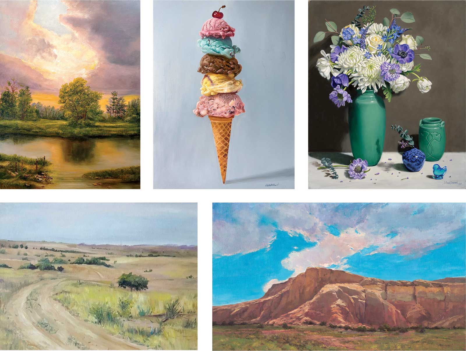 Top: Dimitrina Stamboldjiev Kutriansky, The Last Embrace of Day, oil on canvas, 40 x 30 in.; Eileen Cervera, Balanced Diet, oil, 16 x 12 in.; Jeanne Crain Leemon, Harmony and Happiness, oil on linen panel, 24 x 20 in. Bottom: Ekaterina Stolyarova, Road Through the Steppe, acrylic on canvas, 11 ⁸⁄₁₀ x 15 ¾ in.; Jan Delipsey, Canones, oil on panel, 25 x 40 in.