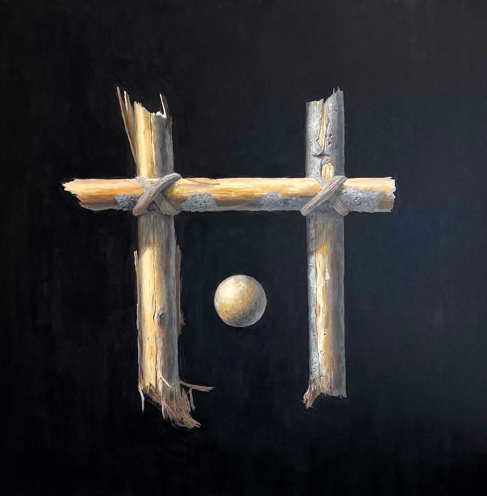 Forest Shrine, a square composition by Peter Swift,embodies reverence for the natural world in a timeless, almost church-like atmosphere. Swift uses wood sticks and twine to create a primeval, spiritual icon. His biggest influences have been Louise Nevelson, Martin Puryear and Andy Goldsworthy. Following in the footsteps of these iconic artists, his goal is to use common objects to create laconic, resonant symmetries.