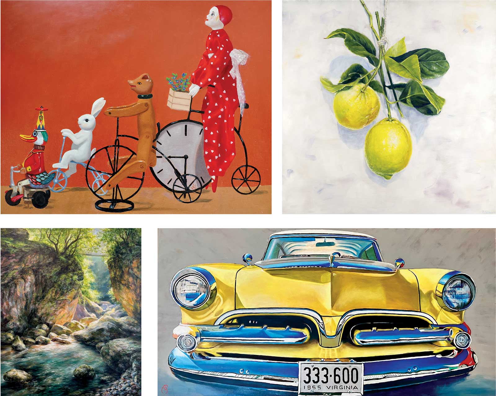 Top: Veronique Fournier-Wynne, Bicycle Buddies, oil on linen, 16 x 20 in.; Robyn Palescandolo, Garden Lemons, oil on canvas, 31½ x 31½ in. Bottom: Tatiana Shitikova, Magic Light, oil on canvas, 39.4 x 47.2 in.; Thomas Mewborn, 1955 Dodge Lancer, oil on canvas, 24 x 48 in.