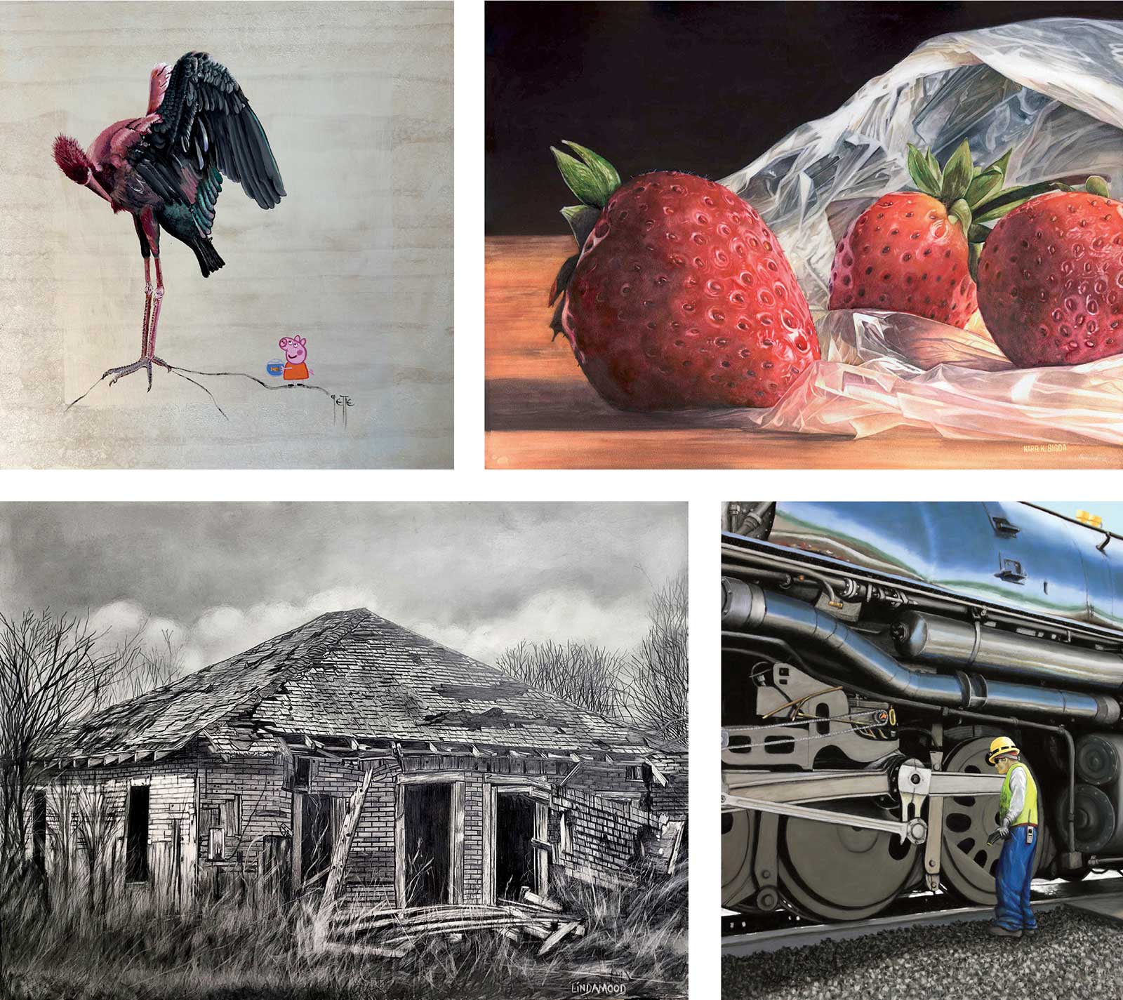 Top: Jette van der Lende, I offer you, oil on panel, 16 x 16 in.; Kara K. Bigda, Strawberries Preserved, watercolor on Ampersand Aquabord, 22 x 30 in. Bottom: Patsy Lindamood, Seen Better Days II, graphite on cradled Claybord, 18 x 24 x 1½ in.; Denice Peters, Maintaining Big Boy, soft pastel, 16 x 20 in.