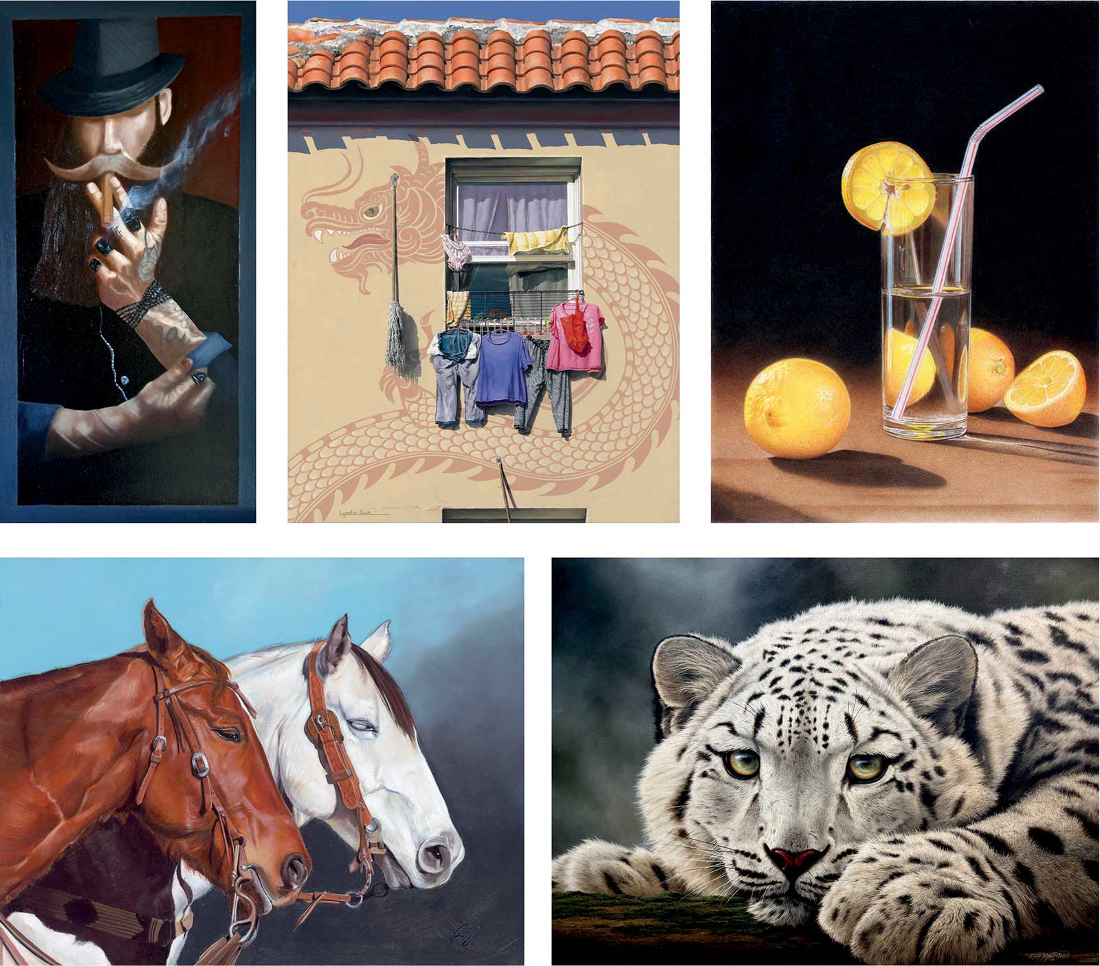 Top: Kerin Freeman, Man With Cigar, oil on block canvas, 30 x 15 in.; Lynette Cook, Hanging Out with the Dragon, acrylic on canvas, 24 x 18 in.; Paco Martin, Lemons and Glass, colored pencil on paper mounted to a board, 10.13 x 7.65 in. Bottom: Paige Weber, Sunny Siesta, oil on ACM panel, 14 x 18 in.; Rob MacIntosh, Edge of Silence, oil on canvas, 30 x 40 in.