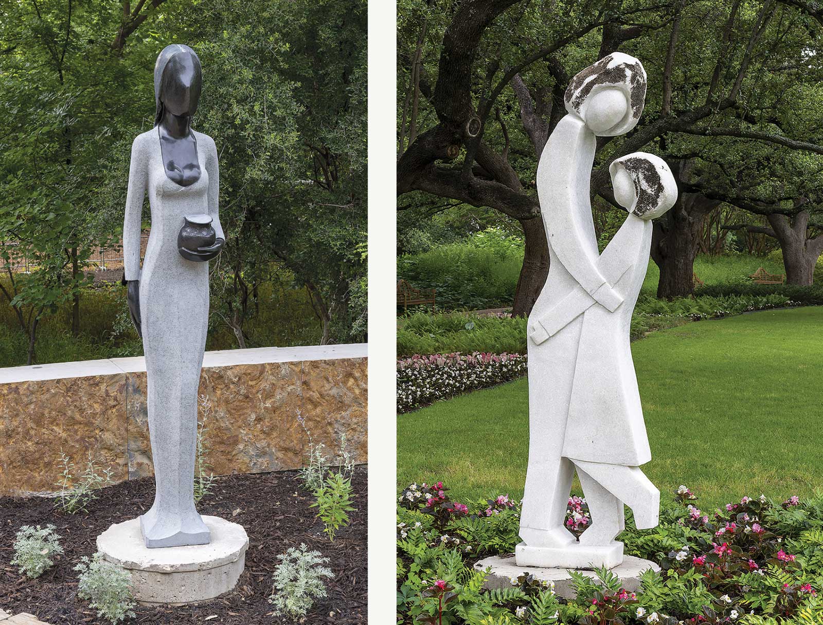 ZimSculpt, Water Bearer, springstone, 72 x 12 x 14 in., by Gregory Mutasa; ZimSculpt, Young Love, dolomite, 9 x 20 x 80 in., by Dominic Benhura.