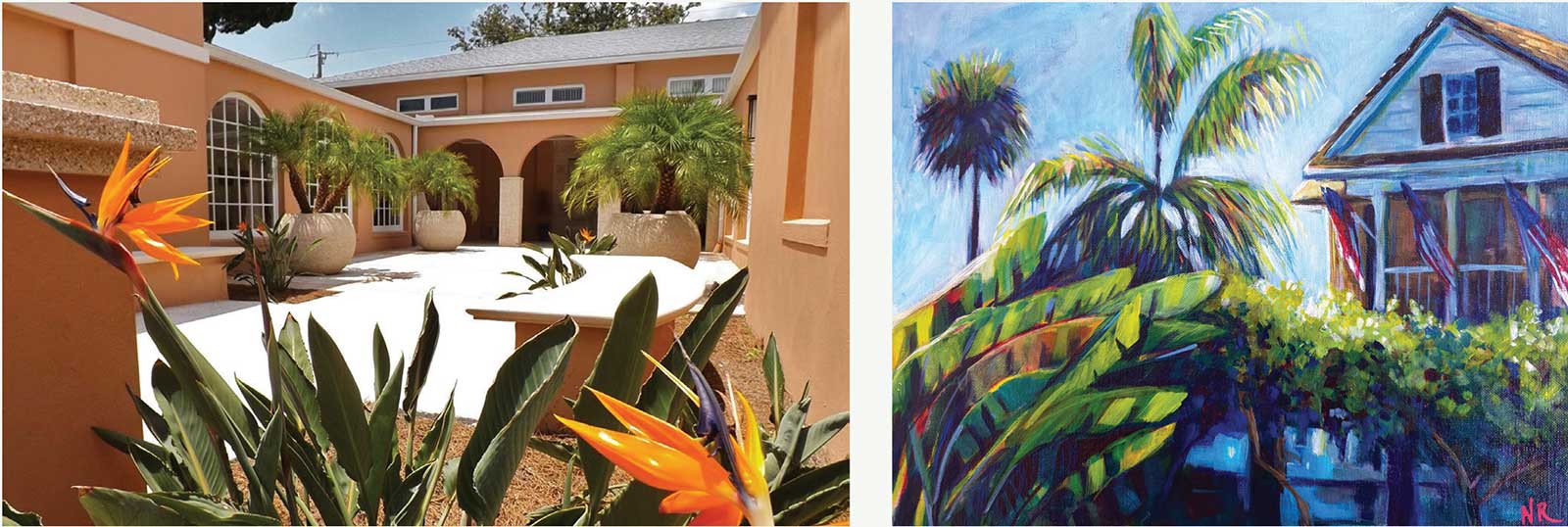 The courtyard at St. Augustine Art Association; St. Augustine Art Association, Saturday Afternoon at O.C. Whites, acrylic, 11 x 14 in., by Nikki Rakov.