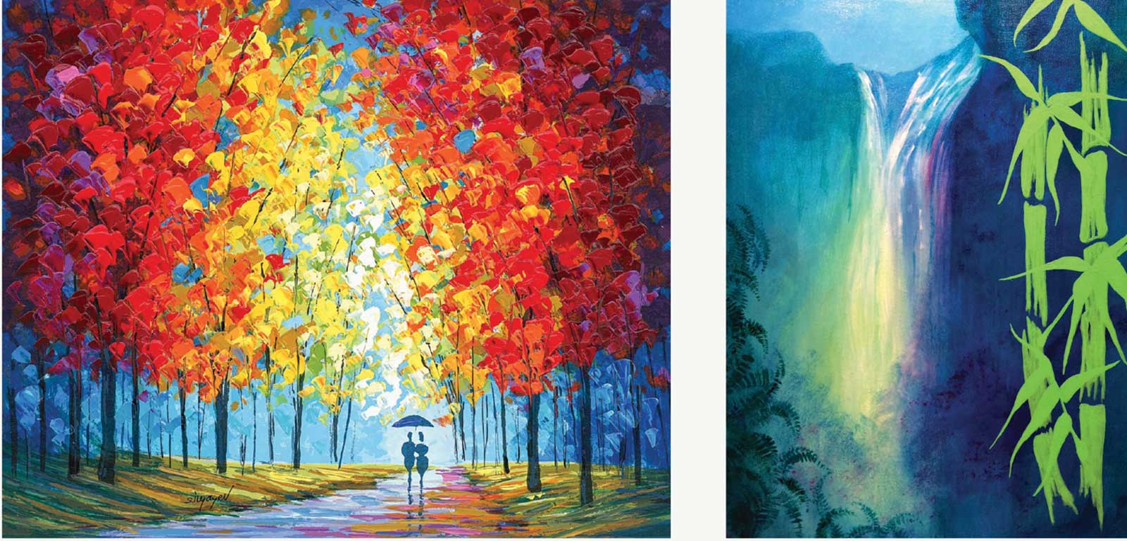 An Art Affair, Walk with Me, oil on canvas, 28 x 38 in., by Slava Ilyayev; An Art Affair, Rainbow Falls, hand-embellished acrylic pour with resin finish, 24 x 18 in., by Melodye Rouisse-Stimpel.