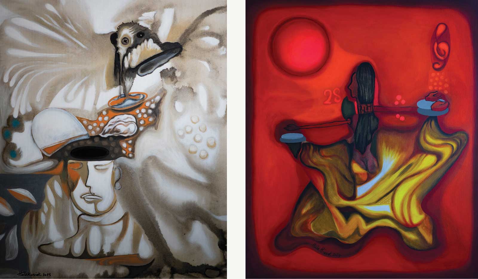 Hala Kusiak, Freedom, acrylic on canvas, 43 ¾ x 36 ¼ in.; Hala Kusiak, Mold Me, acrylic on canvas, 47 x 36 ¼ in.