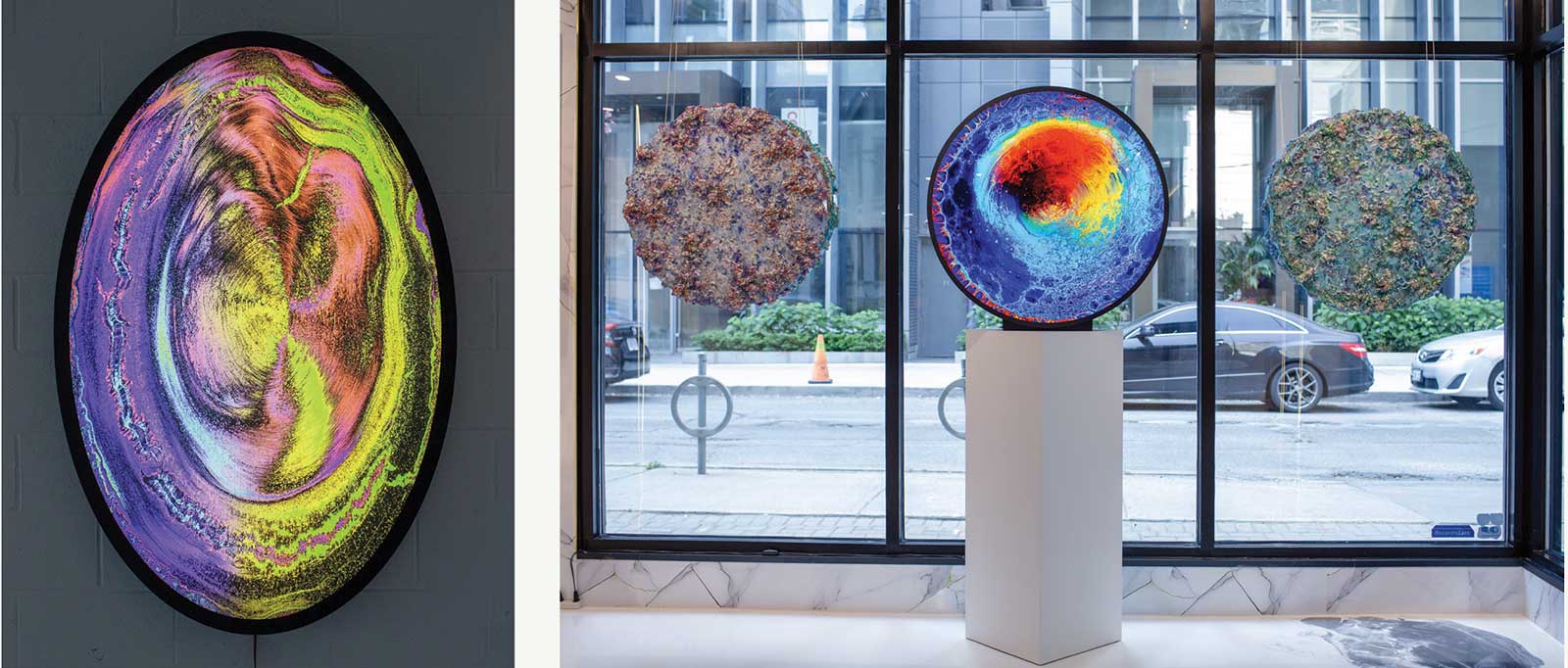 Luminato Gallery, Untitled: Colour-Shifting, mixed media on tempered glass, stainless steel, and LED, 60 x 40 in., by Emre Namyeter; Installation shot of Luminato Gallery featuring artworks by Victoria Kovalenchikova and Emre Namyeter.