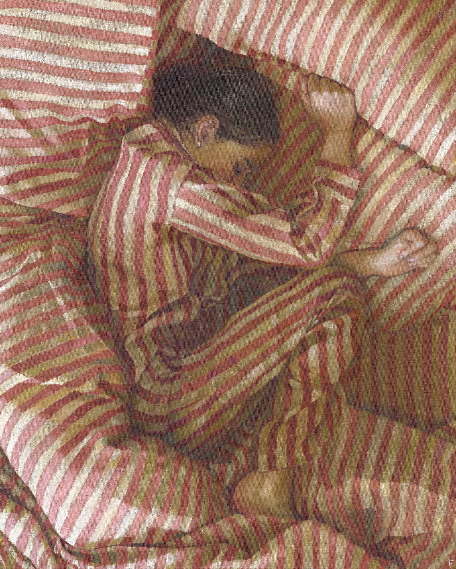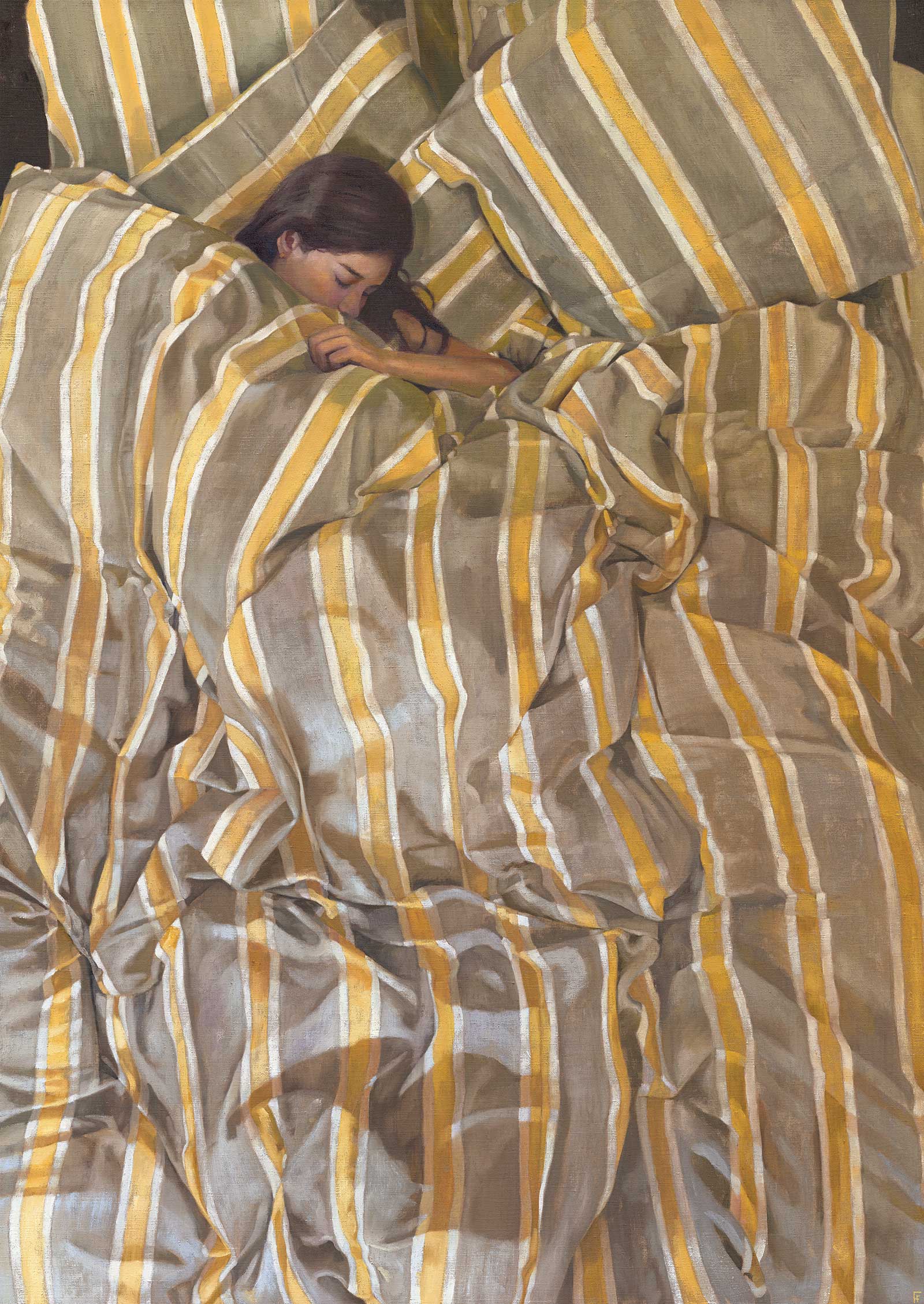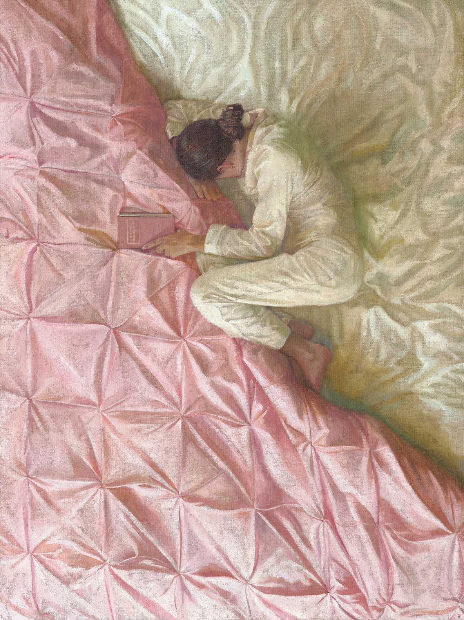 In her latest paintings, the faces of her subjects are obscured, either because they are painted from above or because they are turned into rumpled bedding that, when patterned to match the woman’s sleepwear, they almost disappear into.