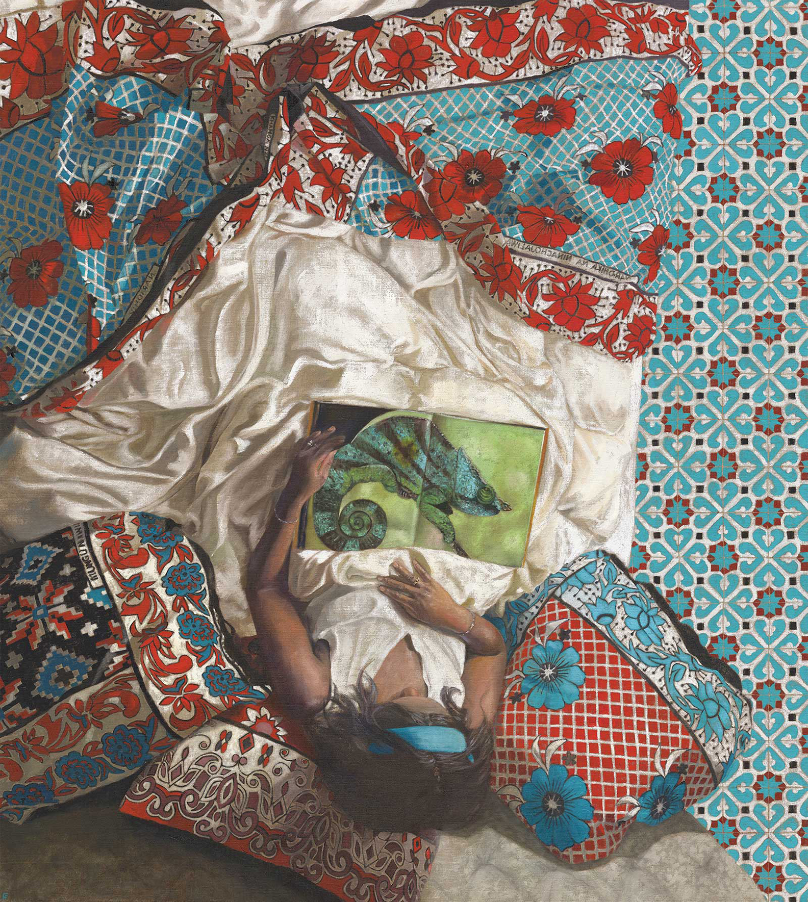 In Field of Dreams,Featherstone is also trying new avenues to explore the recurring themes in her work by taking her scenes outside of the home and into a natural landscape. Still, most of her new paintings are interiors, often set in the coziness of the bedroom. A quote by Irish novelist Cecelia Ahern—“Home isn’t a place, it’s a feeling”—resonates with the artist. “In my paintings, I am trying to convey that feeling we all have of being in our personal space,” she says. “I believe that when we see interiors they speak to some deep primal part of us that always longs for home. This yearning that as humans we all share, and that connects us no matter whether the interiors are of a palatial bedroom in the desert or a fur-covered ice cave in the Arctic circle. Interiors emanate this sense of feeling safe. Somewhere we don’t need to pretend, but where we can be ourselves. Interiors are places where we can venture into our own interior.”