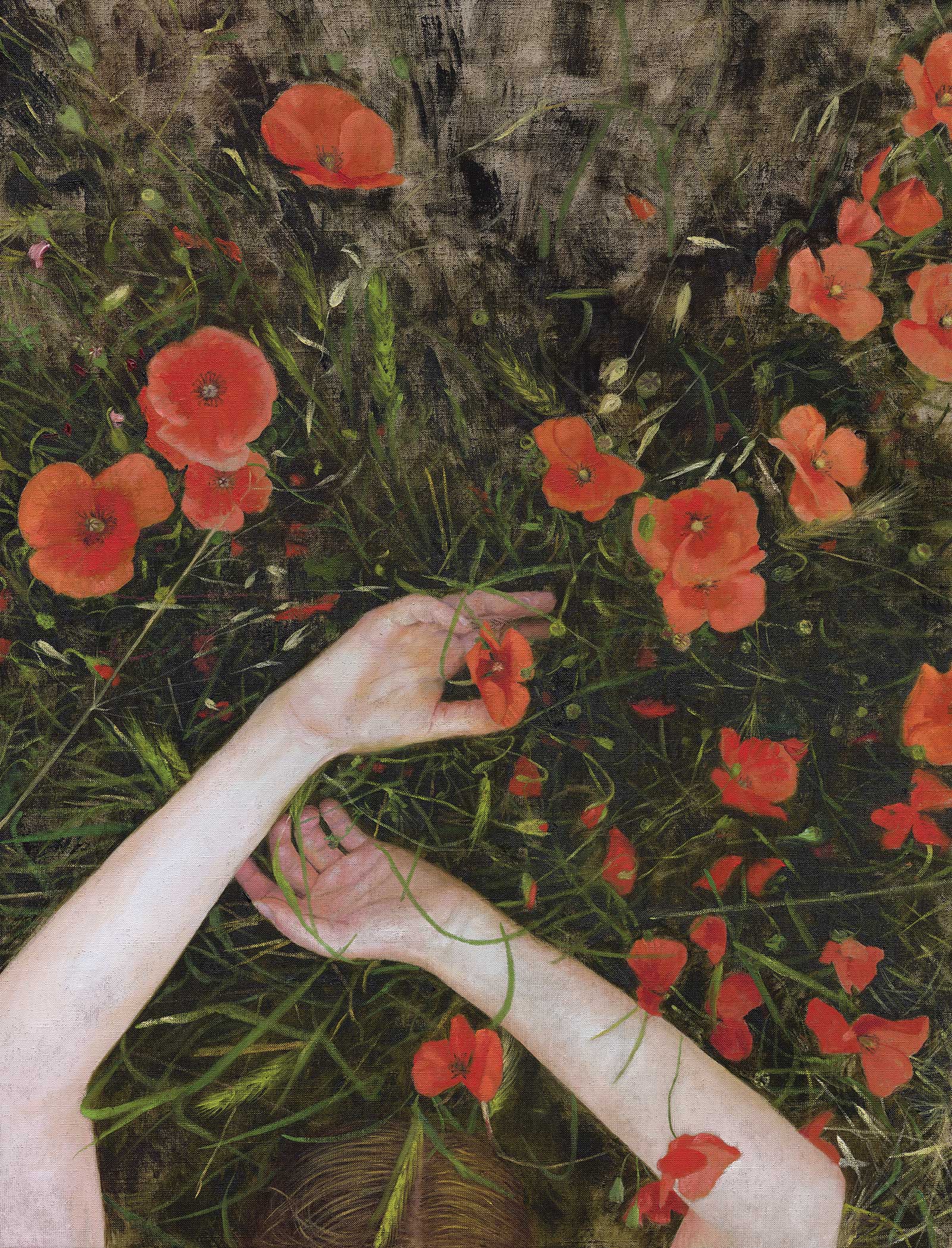 For Featherstone, the presence of poppies, evocative of the Greek myth of Demeter, who created the flower to ease her grief after Hades abducted her daughter Persephone, as well as the dreamy scene in The Wonderful Wizard of Oz, enhances the sense of tranquility that pervades the piece. “We still use poppies as emblems on tombstones to symbolize the eternal sleep that awaits us all…so there is a pathos and melancholy in the sense that the figure in this painting will be laying in this field of dreams forever.”