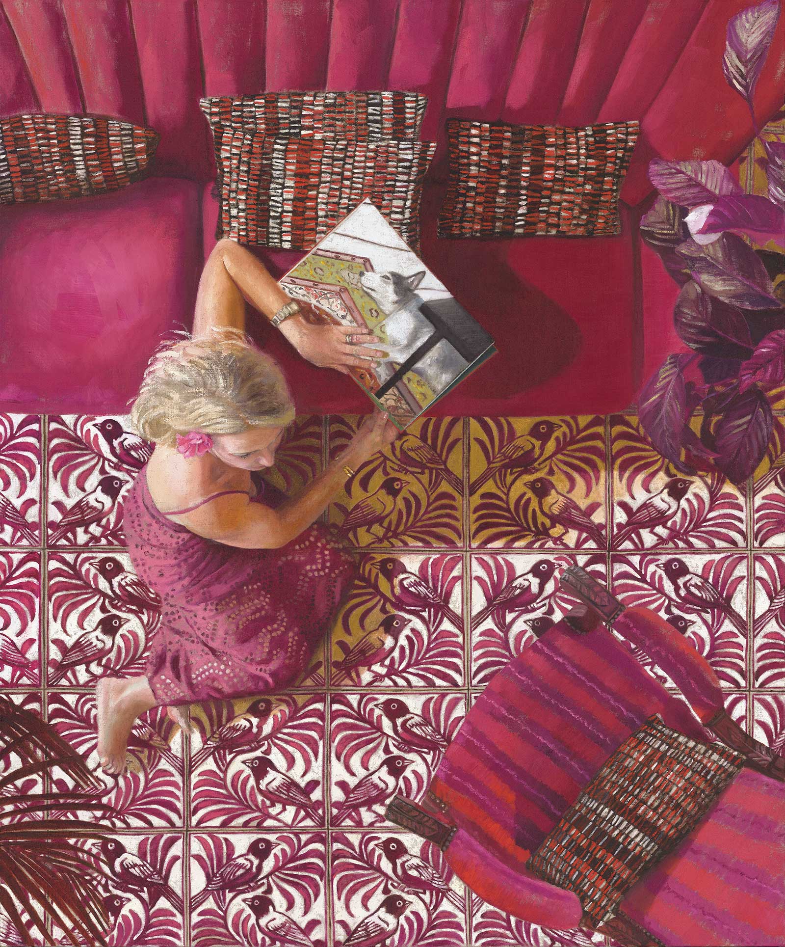 For Featherstone, narrative emerges as the painting develops. For example, as the piece Right Here Waiting,a fuscia-infused delight of pattern and texture, neared completion, she realized the composition was drawing her eye to the empty chair, rather than the tiles, book or the figure. “These aspects are not always intentional,” she says. “I think my most successful paintings are ones that have allowed the narrative to evolve and be open to interpretation.”