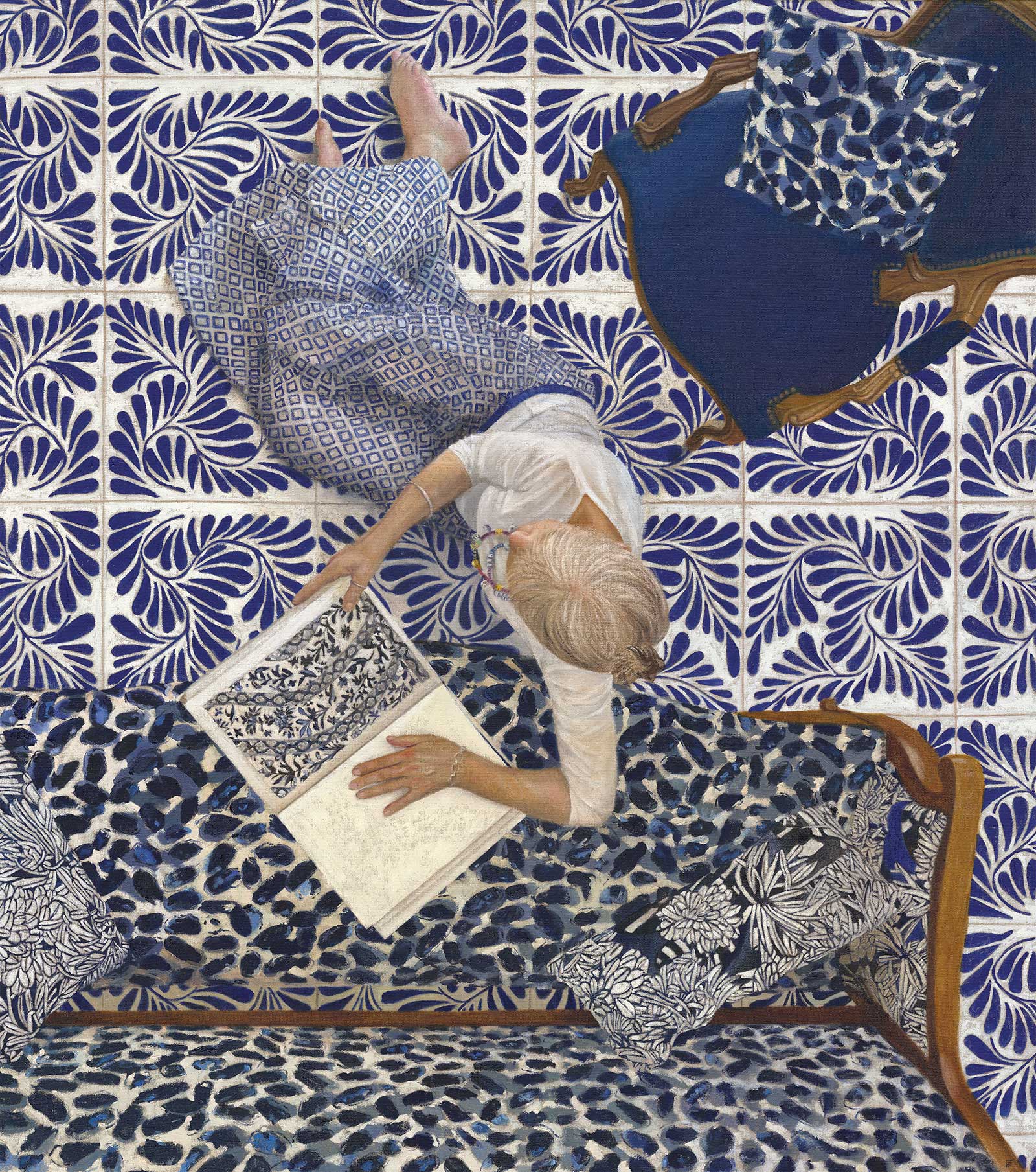 Featherstone also visually plays with themes of chaos and order—and how they can coexist and complement one another side by side. We see this especially in works like Master of Stillness, where the geometric patterns in the tiles and fabric (a combination of African and Persian designs) are juxtaposed with the tussled sheets and haphazard pillows. “The painting explores the balance between order and what is organic which can be a metaphor for our interior and also out exterior world,” she adds.