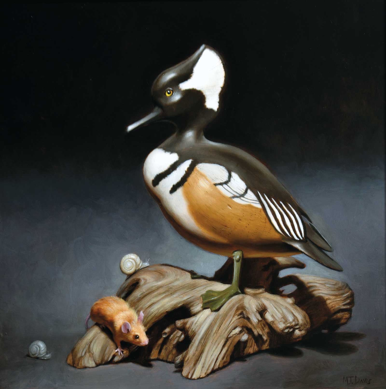 Michael T. Davis, Hooded Merganser, 2 Snails, and Ginger, oil on panel, 12 x 12 in.
