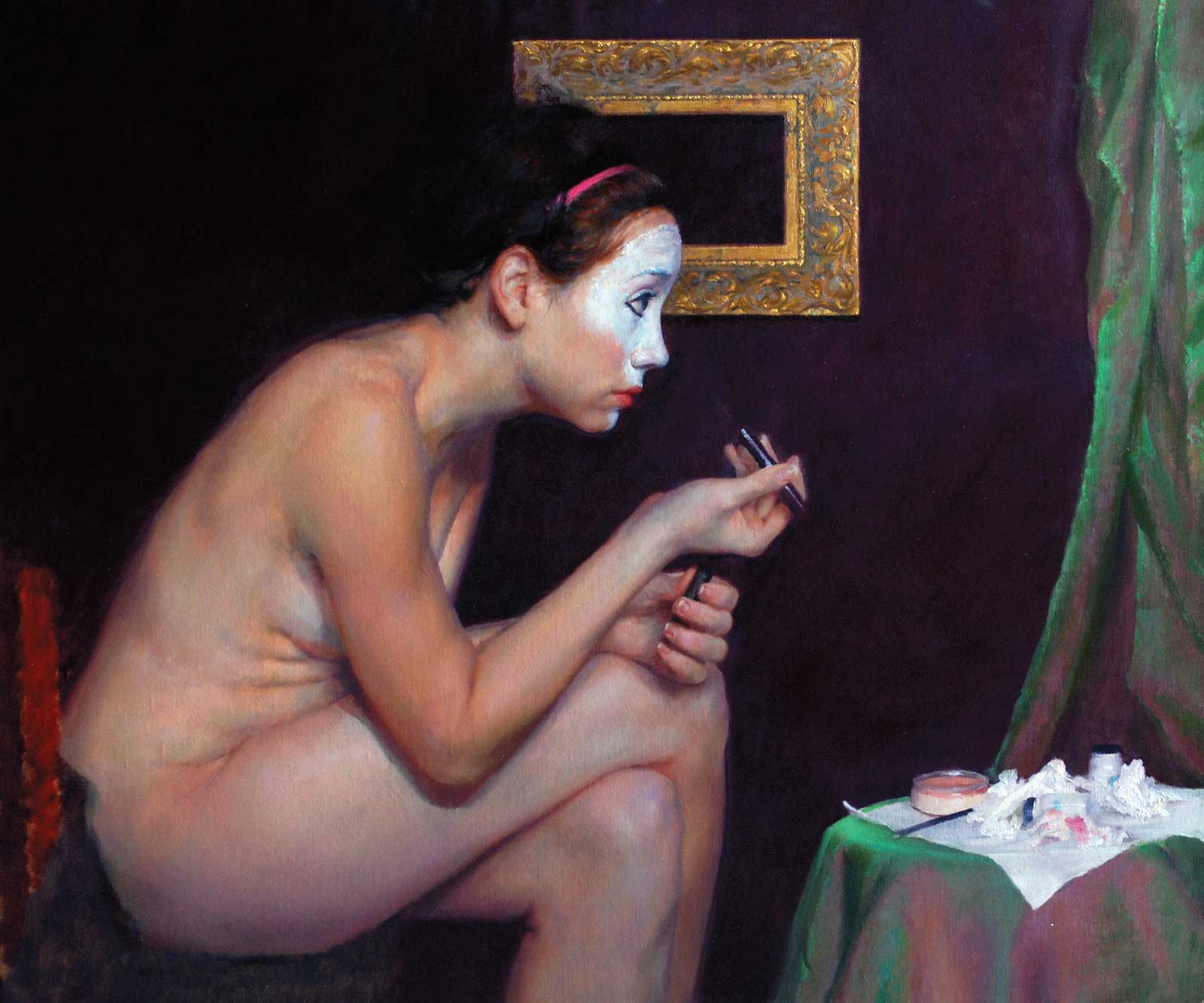 That fine fourth wall in Early’s paintings runs parallel to the proscenium arch of the theater. His backstage I Wanna be Adored #3, set in the dressing room of a nude performer applying white greasepaint, was a breakthrough for him, but music and poetry are at the beginning, middle and end of Early’s process. He found inspiration in Sara Teasdale’s short verses for the painting Two Minds, where the lovers’ arms are discovered braided across a transparent phthalo break of watery depth, above in crisp clarity and mass, and below in veiled atmospheres of uncertainty and occlusion.