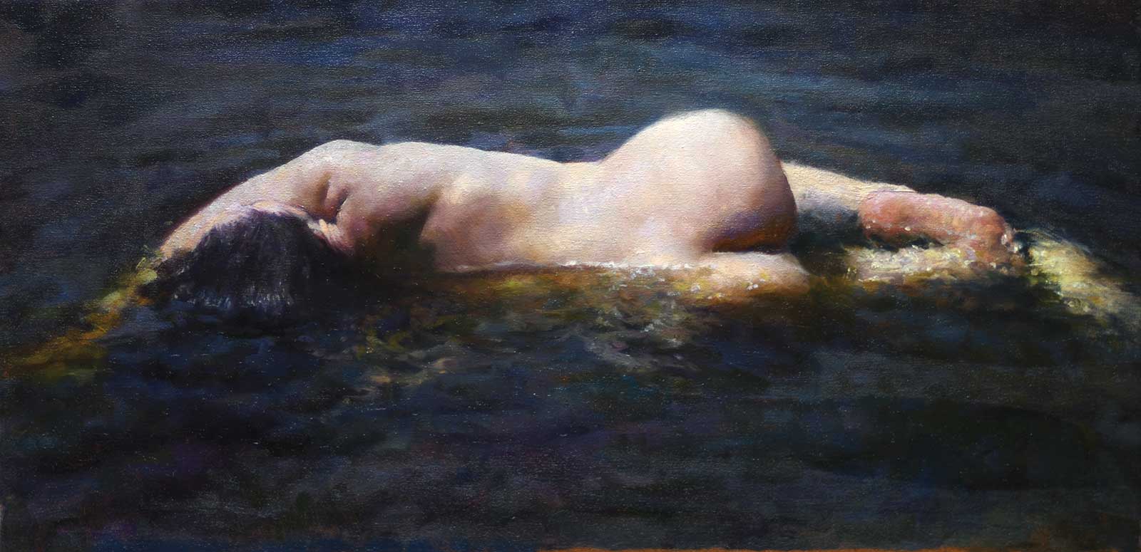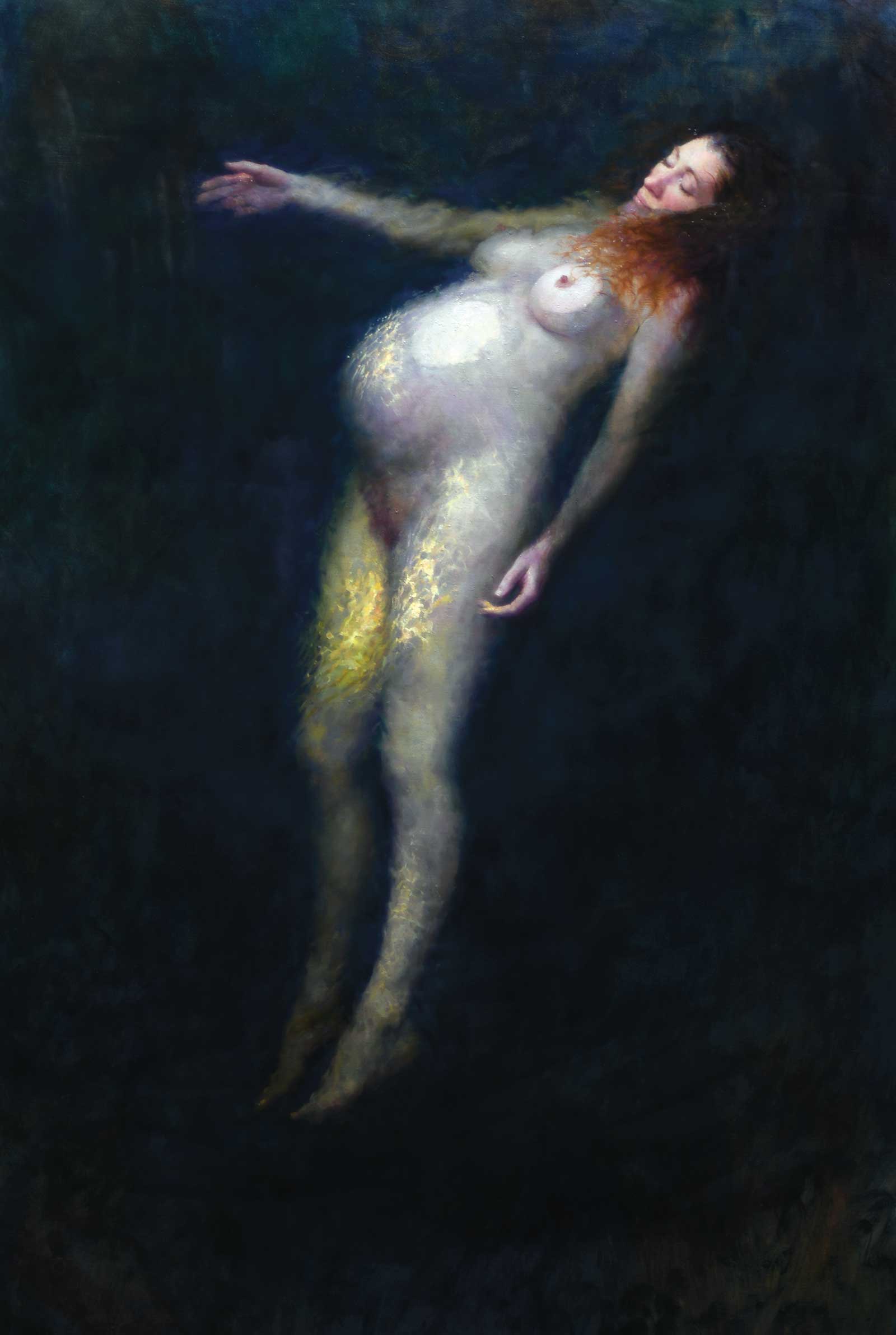Recently, Early has been intrigued by women in water finding true suspension. He jumped at an unusual opportunity when his model, Grace, asked if he wanted to paint her while she was six months pregnant. She knew a secluded swimming hole near her home, and there, Early photographed preliminary studies of her floating weightless in the deep water—a nude and red-haired Ophelia for the present. If The Weight of your Absence was a tragic song of lost love at the end of life, Grace is a painting of the enduring love that is the true gift of being, the lasting love between mother and child, the only love that surpasses death. —