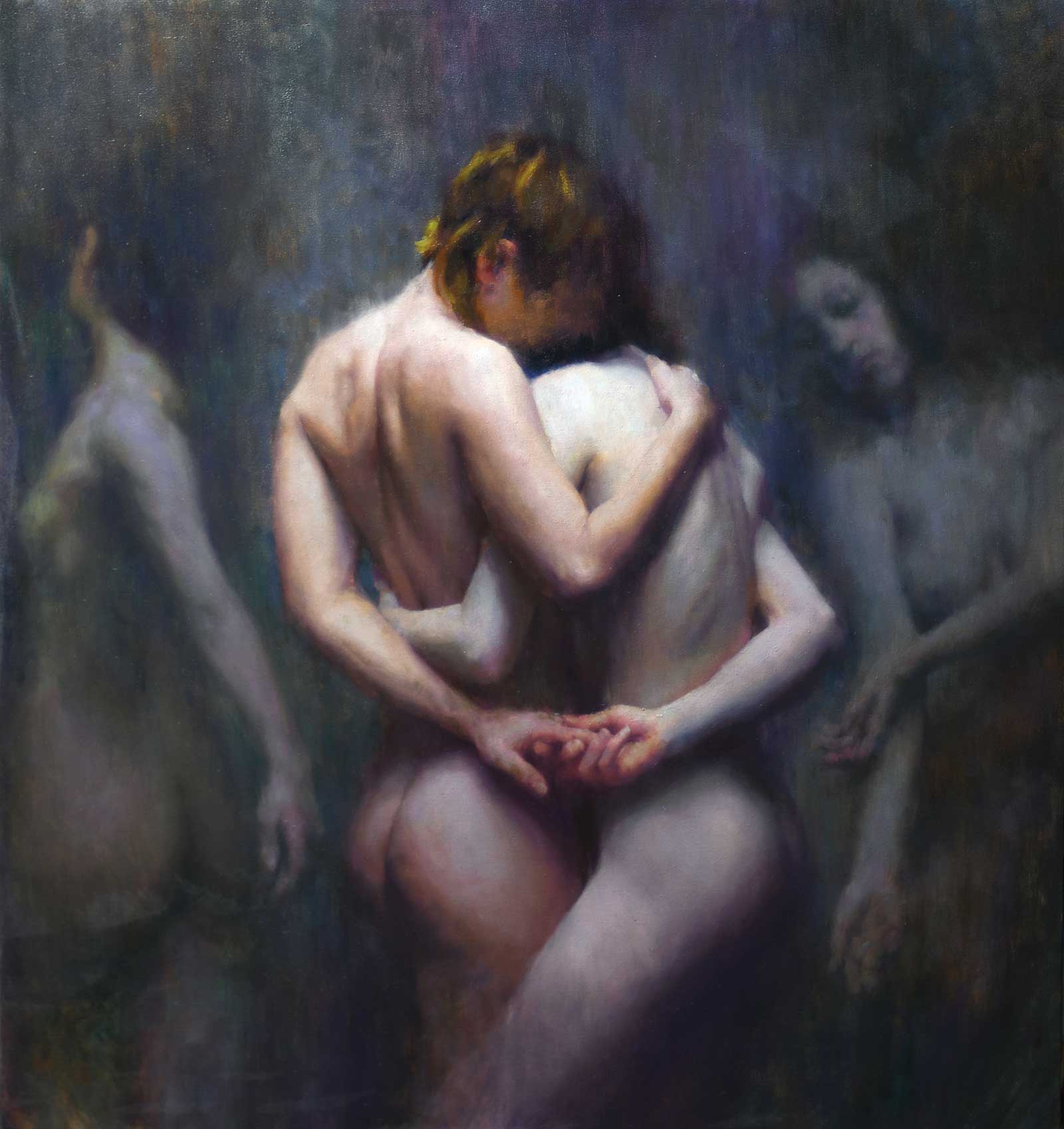 Come Away With Me, oil on linen, 28 x 26 in.What a rare and special pose this is! These whispering figures chosen by Early, a connoisseur of the warm language of dance, crafting a discrete dialogue from the soft poetry of the flesh. The ambiguity of the figures and the uncertainty of their heads suggest a world of possibility. This could be any of us found in this delicate moment—when individuality is lost in a miracle of merging souls, the moment of love when the one meets and melds with the other. The touch of their intimate hands is a secret shared. Early says it’s a fleeting moment of “attraction or connection that is not able to happen, so it happens in private. It’s an intense brief encounter,” as the ghostly dancers in the world upstage can’t see the intensity of the intwined fingers hid behind the backs of the faceless lovers.