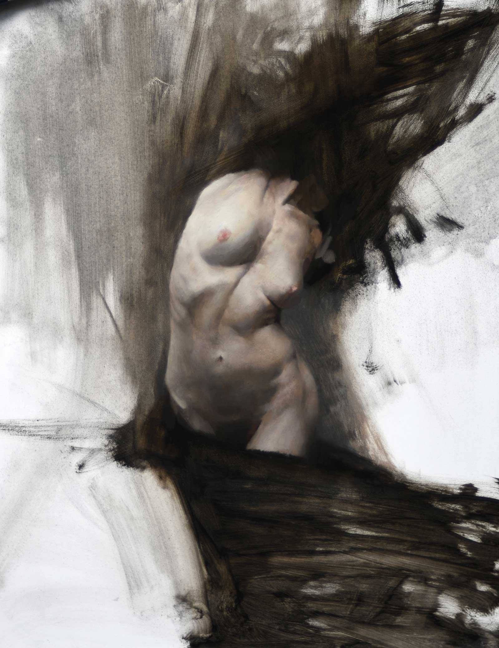 When I met Nelson and started studying with him, he showed me the importance of abstraction, especially in the early stages; a simplification and abstraction, blocking things in and simplifying all the complexity of the figure and the muscles and thinking of the shapes of the design of light and shadow and the beautiful shapes that happened in the poses that had nothing to do with the detail of the form. So, that’s how I start everything.” He attributes his own mastery of the life that seems to be present in the flesh of his figures to studying Shanks at work, commenting that in some of his mentor’s paintings he felt he could see the blood of life flowing beneath the skin. Early says Shanks showed him he wasn’t looking hard enough or deeply enough. “He opened my eyes to seeing in a more profound way,” he says.