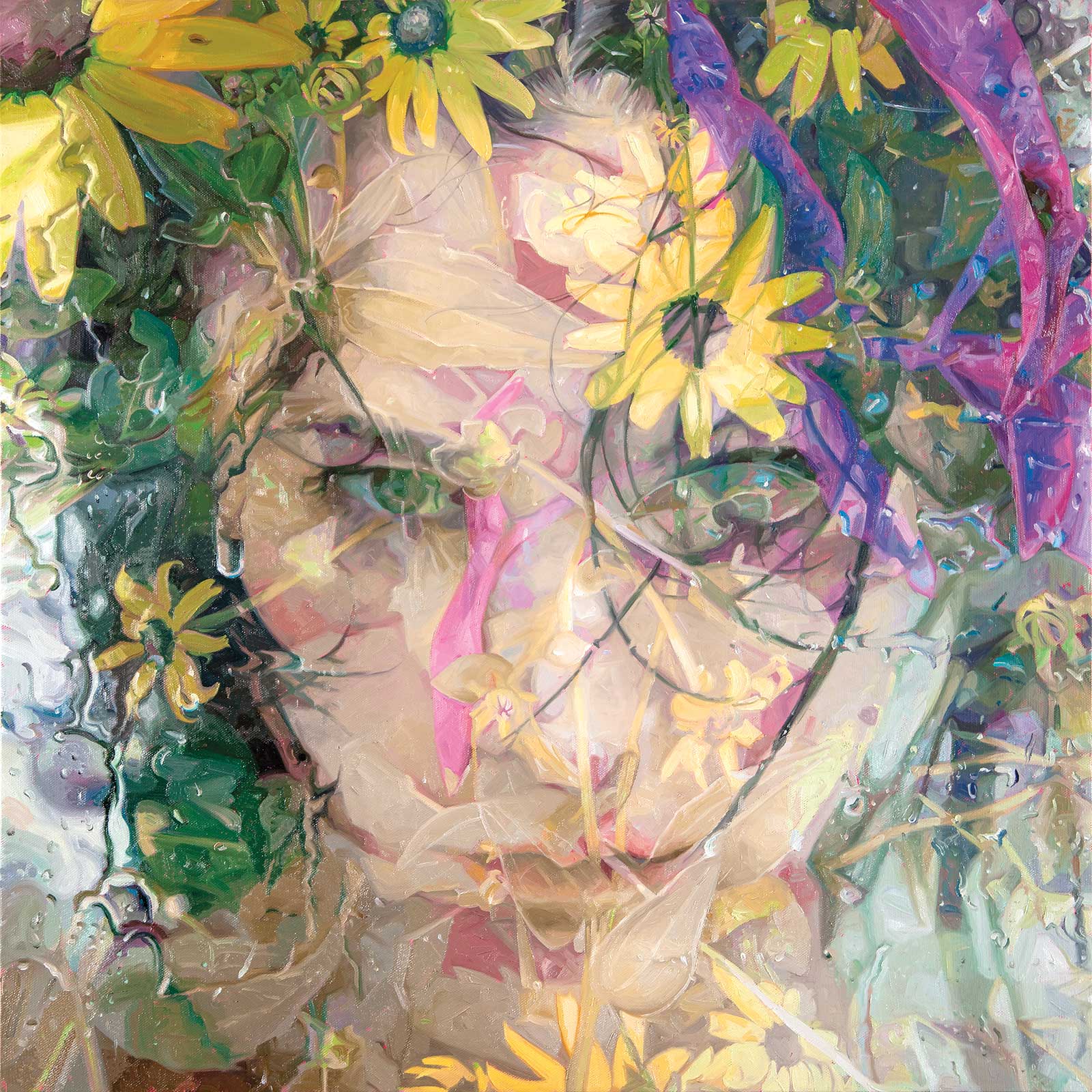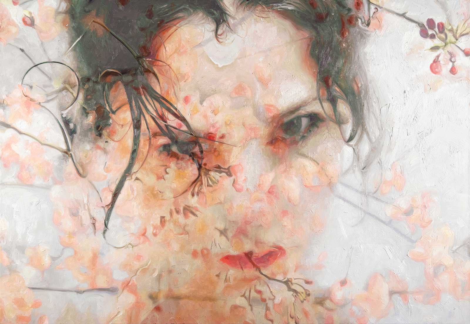 Still deeply moved by her mother’s death, but continuing her theme of self-examination, Monks painted herself in the spiritualist mood, like Narcissus peering through floating petals into the reflecting pool, losing her identity among the delicate fragments of flowers and fractured reflections, especially scattered in her No One Can See Everything, and the shattered self in Stay Focused. Now, the formal glass proscenium of the theatre of the shower dissolved into the ethereal separation between life and the mirror.