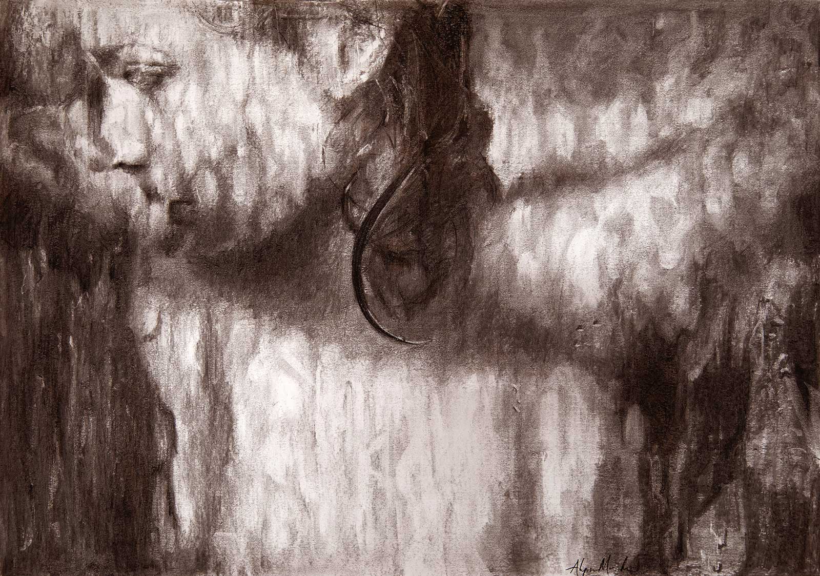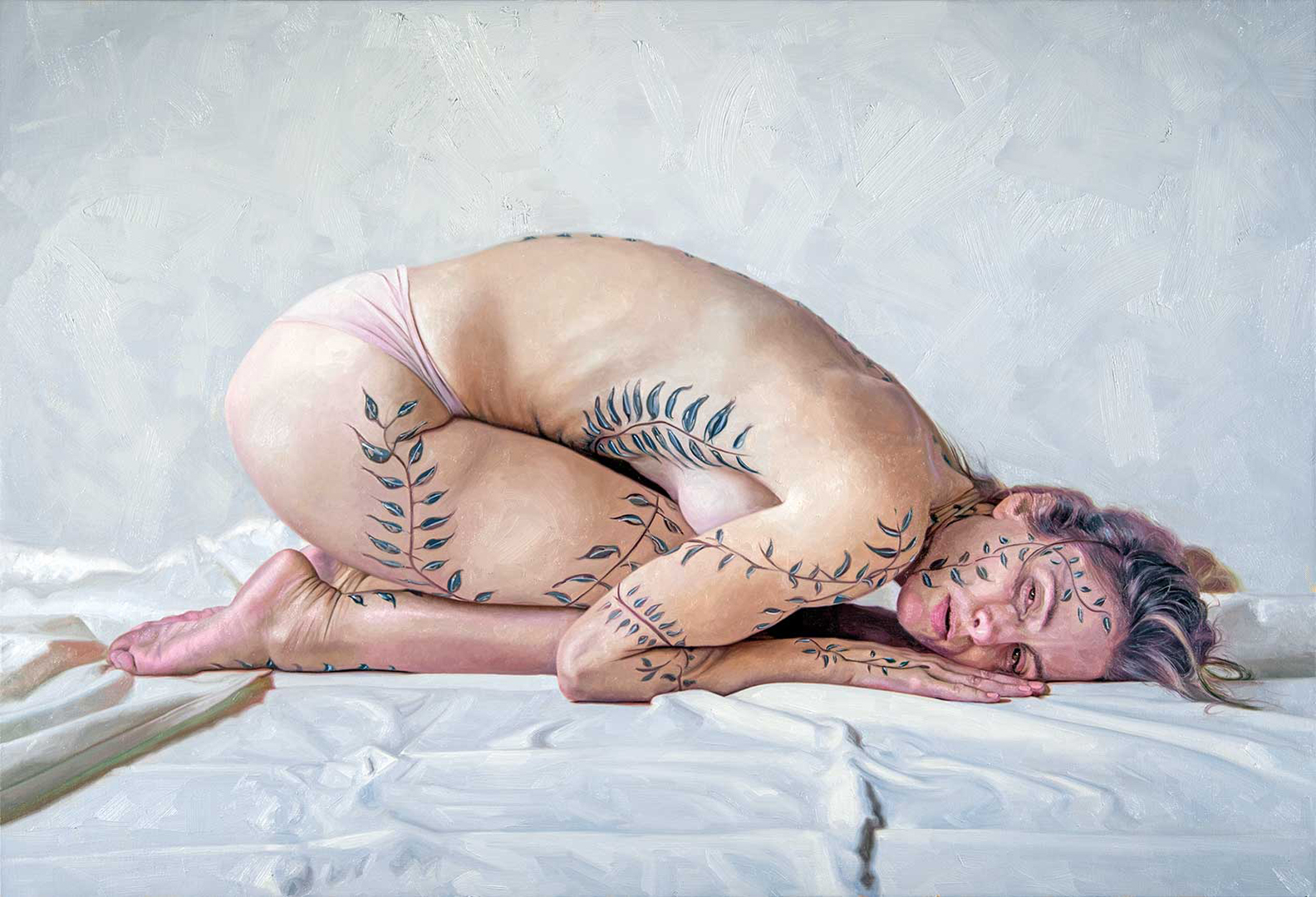 Briefly retreating from the fading spaces between the spirit world and materiality, but with her mind still firmly focused in the in-between, she embodied the dryad in Between Here and There, first drawing the foliage of vines onto her model with make-up pens, then painting a representational image of her folded over her knees in the exhausted fetal attitude of supplication. Unusually for Monks, the nude is staged in a bedroom, on pure white sheets, but the bed and the bath are the most private spaces in a home, and the bed is the liminal place where life is conceived and where we die. The bed, where we travel in sleep to the otherworld of dreams and the gods. This dryad’s spirit is at the core of self-examining Monks, that wild tree spirit protected by the ancient dragon that the new man Cadmus killed at Ismene’s pool, spearing her guard to the tree.
