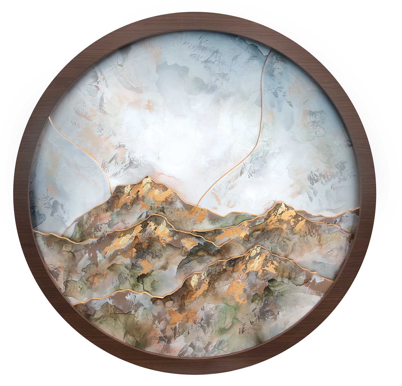 Although all of Leah Rei’s works are abstract representations of the natural world, the artist’s main goal is to create scenes that can evoke a deep sense of calm and wonder. Utilizing a variety of acrylic paint and mediums, accented with gold or silver leaf, each piece is a study of sunlight—both visually and emotionally. Through the weaving of metallic pigments layered under transparent washes, viewers are invited to meander through Rei’s dreamscapes and find joy, solace and a breath of fresh air.
