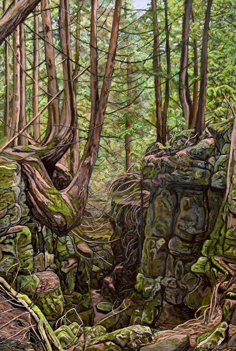 The Rattling Brook Falls are located near Mount Carmel, Newfoundland and are both beautiful to look at and emit a feeling of wonder at how the water cascades down and the sun reflects multiple shades of colour over the pink, and mauve rocks. This painting tied for third out of sixty six countries in the American Art Awards.