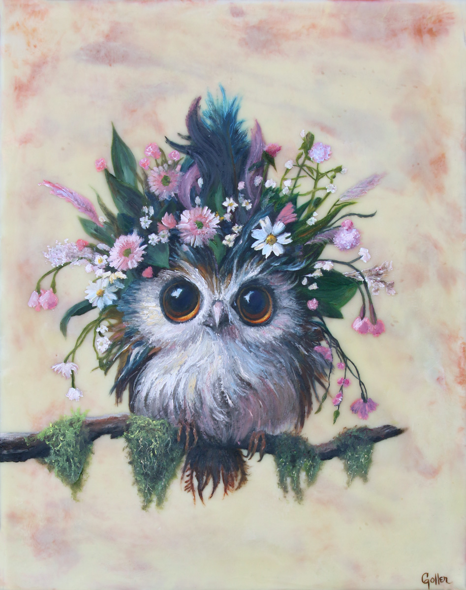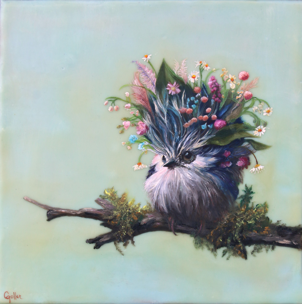 Griffin is a 10x10 bird painted in mixed media - oil/encaustic on panel by Carrie Goller, from her Floriferous Collection. Framed in a minimalist, classic black wood float frame.